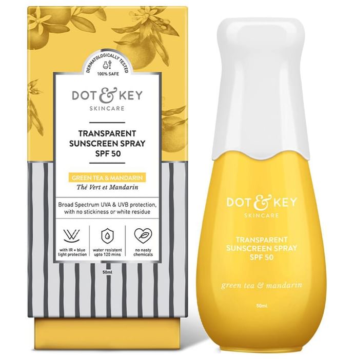 Behind the revolutionary products is an obsession with little things. | Dot & Key Transparent Sunscreen Spray SPF 50 is a fresh take on skincare. Dot & Key identifies the blind spots in your skincare routine and addresses minor needs by providing specialised solutions which are entirely safe, delightfully gentle and unquestionably effective. | Key Ingredients: Mandarin orange Green tea leaf Vitamin E | Key Benefits: Mandarin orange is rich in Vitamin C antioxidants; it helps in protecting the skin against free radical damage, thereby reducing the signs of ageing like wrinkles, fine lines and blemishes It is anti-inflammatory, and antioxidants in green tea, such as catechins, help rejuvenate skin cells and give a healthy glow. Soothes and comforts skin that’s been exposed to the harsh sun Vitamin C with potent anti-inflammatory actives protects the skin against environmental pollution and UV radiation It prevents premature signs of ageing, giving a youthful, healthy skin | Directions for Use: Spray the sunscreen liberally all over the body 15 minutes before stepping out in the sun Rub in till completely absorbed Spray on your hands and then apply to the face Reapply in case of excessive sweating or water exposure Avoid exposure to the sun between noon and 4 pm | Safety Information: Read the label carefully before use Store in a cool and dry place, away from sunlight Keep out of reach of children