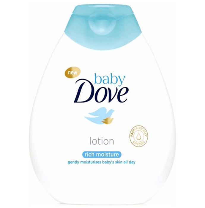 Dove Baby Lotion Rich Moisture is excellent for baby’s delicate skin. It has hypoallergenic and pH neutral formula that ensures total skin care. It helps in making the skin smooth and nourished from first use itself. | Key Ingredients: Water Glycerin Petrolatum | Key Benefits: Moisturises baby’s delicate skin gently Hydrates and nourises the skin Soothes skin and prevents dryness Free from parabens or phthalates Has a soft fragrance and is safe for baby’s delicate skin | Directions for Use: After bath time, warm the lotion in your hands and massage gently into baby’s skin. | Safety Information: Read the label carefully before use Keep out of the reach of children Store in a cool dry place away from direct sunlight For external use onyl Use under medical supervision