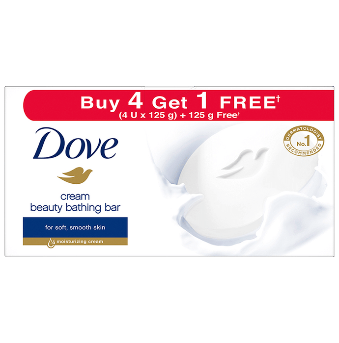 Dove Cream Beauty Bathing Bar for Soft, Smooth, Moisturised Skin (125gm Each) Buy 4 Get 1 Free Dove Cream Beauty Bathing Bar combines a gentle cleansing formula with Dove’s signature ¼ moisturizing cream to give a softer, smoother and more glowing skin with every shower. Dove is the No.1 Soap Brand recommended by dermatologists. It is pH balanced and mild on the skin making it suitable for all skin types. Regular soap may dry out your skin, but the classic moisturizing formula of Dove bars will leave skin softer, smoother and more glowing.