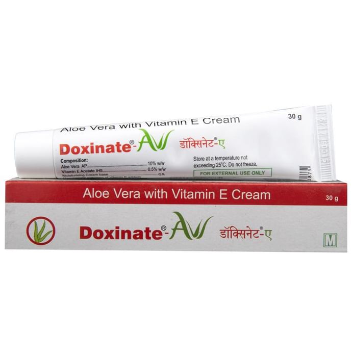 Doxinate A Cream contains Aloe vera and Vitamin E Acetate as active ingredients Key benefits/uses of Doxinate A Cream: Role of active ingredients: - Aloe vera: Hydrates skin and provides a soothing and moisturizing effect on the skin. It acts as anti-histaminic and anti-pruritic It has anti-inflammatory properties and reduces inflammation related to pruritus.It promotes effectual wound healing by stimulating the growth of fibroblasts.It protects the skin against UV rays, having anti-microbial (against fungi, bacteria, and virus) activity.It has an anti-acne and anti-wrinkle effect.It helps to remove scar from skin - Vitamin E Acetate: Protect the skin against sun damage, reduces the signs of aging including fine lines, wrinkles, and brown spots Directions for use/Dosage: - As directed by the physician Indication: - Skin Care Safety information: - For external use only - Read the label carefully before use - Keep out of the reach and sight of children