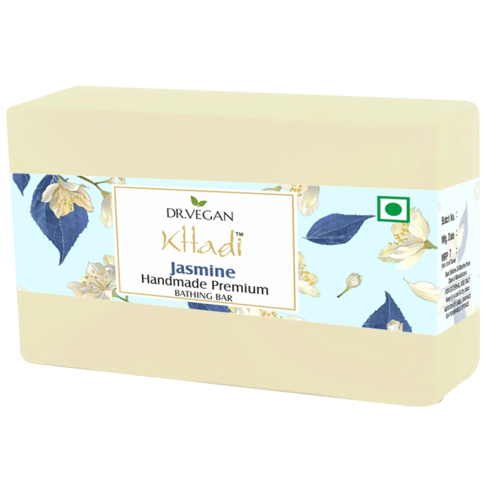 Dr. Vegan Khadi Handmade Premium Bathing Bar is handcrafted and contains premium ingredients from mother earth. Each one is carefully selected for the benefit of the skin, ensuring a rejuvenating experience. | Key Ingredients: Jasmine essential oil Glycerine Soap base | Key Benefits: Vegan and cruelty-free Gentle cleansing soap Removes germs and grime from your skin Gives you long-lasting fragrance Moisturizes the skin Maintains the oil balance of the skin Leaves your skin soft and calm | Directions For Use: Apply soap on wet body and face, rub to produce lather, then wash off. | Safety Instructions: Read the label carefully before use Store in a cool and dry place, away from sunlight Keep out of reach of the children