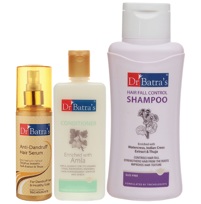 Dr Batra's Combo Pack of Anti-Dandruff Hair Serum, Conditioner and Hair Fall Control Shampoo Dr Batra's Hair Fall Control Shampoo, made with natural extracts is the best mild shampoo for hair fall control. Strengthened with Thuja occidentalis (white cedar), it helps to inhibit DHT thus reducing the risk of hair loss. Watercress and Indian cress extracts strengthen the hair follicles from root to tip thereby arresting hair fall. Capsicum extract helps to accelerate the growth of new hair. Dr Batra's Conditioner is one of the best hair conditioners to keep dry and brittle hair at bay. It is enriched with Amla extracts that have time-tested properties which act as a natural hair conditioner, improve texture and add shine. So give your hair the love it deserves with this hair conditioner and enjoy hair that is not just manageable but also feels healthier. Itchy hair is common, especially if it's caused by dandruff. Dr Batra brings to you the best Anti-Dandruff Hair Serum from the house of trichologists and dermatologists. It effectively helps fight dandruff and maintains a healthy scalp. | Key Ingredients: Watercress Indian cress Thuja Amla Ziziphus joazeiro bark extract | Key Benefits: It helps to inhibit DHT thus reducing the risk of hair loss It is free from paraben, sulfate and silicone which makes it suitable for all types of hair It stimulates hair growth and regains hair vitality Strengthen the hair follicles from root to tip thereby arresting hair fall | Directions For Use: Use as directed on the label or as advised by your healthcare provider | Safety Information: For external use only Keep out of the reach of children Store in a cool and dry place away from direct sunlight