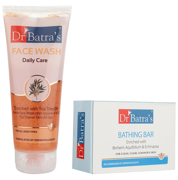 Dr Batra's Combo Pack of Face Wash Daily Care 200gm and Bathing Bar 125gm Dr Batra’s face was that daily care eliminates dirt, moisturises the skin and protects the skin from impurities. Dr Batra's Bathing Bar is made with natural extracts, making this one of the best bathing soaps. It is enhanced with the natural goodness of glycerine to provide long-lasting moisturising benefits. | Key Ingredients: | Daily Care Face Wash Echinacea extracts Tea tree oil Vitamin B3 Vitamin E | Bathing Bar Echinacea Berberis aquifolium Glycerine | Key Benefits: | Daily Care Face Wash A cleansing face wash that is rich in antioxidants and antibacterial properties, helps fight blemishes This face wash is enriched with echinacea extracts and tea tree oil Vitamin B3 protects the skin against ultraviolet rays and environmental damage Vitamin E - a powerful natural antioxidant - soothes and moisturises skin and facilitates tissue repair | Bathing Bar This bathing bar provides a smooth feel to the skin It provides protection against environmental pollutants Echinacea extract has natural antibacterial properties and prevents allergic reactions It contains tea tree oil which is rich in antioxidants and antibacterial properties and helps fight blemishes | Directions For Use: Read the label carefully before use. | Safety Information: Read the label carefully before use Store in a cool and dry place away from direct sunlight Keep out of reach of children