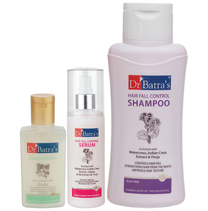 Dr Batra's Combo Pack of Hair Fall Control Serum 125ml, Conditioner 100ml and Hair Fall Control Shampoo 500ml Dr Batra's hair fall control serum is a blend of natural extracts like Thuja occidentalis (white cedar) that helps to inhibit DHT and reduce the risk of hair loss. Dr Batras Conditioner is rich with amla extracts for hair so smooth and soft also nourishes and moisturizes dry, frizzy, damaged and tangled hair. Dr Batra’s hair falls control shampoo helps control hair fall, strengthens hair from the roots and improves hair texture. | Key Ingredients: | Hair Fall Control Shampoo Thuja Watercress Indian Cress Extract Capsicum extract | Conditioner Amla Henna Cetyl alcohol Cetearyl alcohol PEG-40 castor oil and stearalkonium Disodium edta | Hair Fall Control Serum Purified water Glycerin Nasturtium officinale extract Tropaeolum majus extract Glycerine Emblica officinalis (Amla extract) Lawsonia inermis extract Thuja occidentalis bark extract | Key Benefits: | Conditioner Makes the hair soft, strong and more resistant to damage Controls the frizz and enhances the radiance Keeps the damage out by retaining the moisture in | Hair Fall Control Serum Vitamin C in it gives the hair lustre and softness, and so provides overall nourishment Watercress and Indian cress extract strengthens and prevents hair loss from the root This hair fall prevention serum also helps to alleviate scalp dryness Henna maintains the scalp's acid-alkaline balance without damaging the hair's natural balance | Hair Fall Control Shampoo Watercress and Indian cress extract strengthens hair from the root and prevent hair loss Capsicum extract, helps to accelerate the growth of new hair Ginseng protects the scalp from harmful effects of environment Amla provides natural conditioning properties that improve overall texture and provide nourishment | Directions For Use: Read the label carefully before use. | Safety Information: Read the label carefully before use Store in a cool and dry place away from direct sunlight Keep out of reach of children