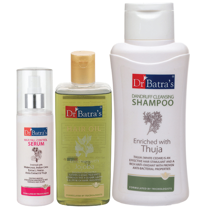 Dr Batra's Combo Pack of Hair Fall Control Serum 125ml, Hair Oil 200ml and Dandruff Cleansing Shampoo 500ml Dr Batra's hair fall control serum is a blend of natural extracts like thuja occidentalis (white cedar) that helps to inhibit DHT and reduce the risk of hair loss. Dr Batra’s dandruff cleansing shampoo is enriched with Thuja (white cedar) which is rich in anti-oxidants with proven anti-bacterial properties. Dr Batra’s hair oil restores texture, glow and lustre of hair naturally and prevents split-ends. Nourish your hair regularly with this for damage-resistant and healthy hair. | Key Ingredients: | Hair Oil Jojoba extracts Brahmi | Dandruff Cleansing Shampoo Thuja | Hair Fall Control Serum Purified water Glycerin Nasturtium officinale extract Tropaeolum majus extract Glycerine Emblica officinalis (Amla extract) Lawsonia inermis extract Thuja occidentalis bark extract | Key Benefits: | Dandruff Cleansing Shampoo Thuja has rich anti-oxidant and anti-bacterial properties Balances oil production of the scalp by improving blood circulation The ideal balanced pH ensures the shampoo treats your scalp with all the gentle care it deserves | Hair Fall Control Serum Vitamin C in it gives the hair lustre and softness, and so provides overall nourishment Watercress and Indian cress extract strengthens and prevents hair loss from the root This hair fall prevention serum also helps to alleviate scalp dryness Henna maintains the scalp's acid-alkaline balance without damaging the hair's natural balance | Hair Oil The goodness of Jojoba oil promotes hair growth and is a good conditioner It restores texture, glow and lustre of hair naturally and prevents split-ends Nature's treasure - Brahmi - calms the nerves and imparts a sense of relaxation Nourish your hair regularly with this for damage-resistant and healthy hair | Directions For Use: Read the label carefully before use. | Safety Information: Read the label carefully before use Store in a cool and dry place away from direct sunlight Keep out of reach of children