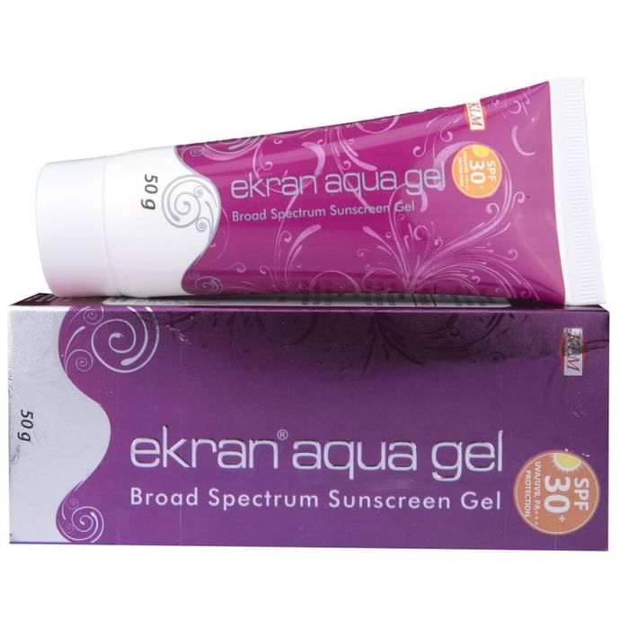 Ekran Aqua Gel is used in cases of photodamage to skin, dry skin, sunburn, skin protection against UV rays, skin protection against ultraviolet radiation induced suppression of the immune response. It neutralizes fatty acids and other conditions. | Key Ingredients: OMC Avobenzone PBSA | Key Benefits: PBSA is photosensitizes the formation of oxidized guanines in cellulo after UV A or UV B exposure Avobenzone is an oil soluble ingredient used in sunscreen products to absorb the full spectrum of UVA rays OMC is an Octylmethoxycinnamate that is a pale yellow oily liquid which is used for UVB Category 1 sunscreen for OTC sun protection products Considerable retardation in the aging of the skin with excellent tolerance and stability | Directions For Use: Taken sufficient quantity of Ekran Aqua Gel Apply liberally to cove the exposed area Apply 15-30 minutes before the sun exposure and reapply after every 2 3 hours and after swimming Avoid contact with eyes | Safety Information: For External use only Keep out of the reach of children Store in a cool‚ dry and dark place.