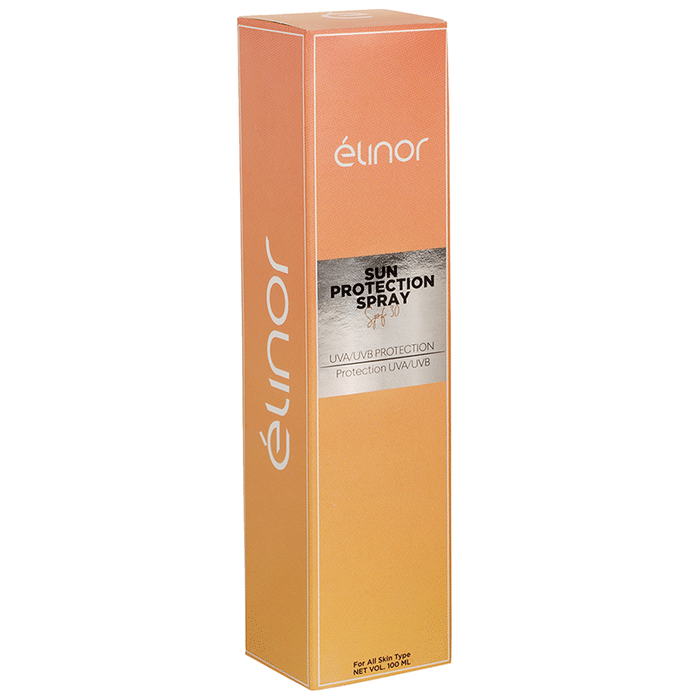Elinor Sun Protection Spray SPF 30 It is a broad spectrum sunscreen formulated with blueberry, raspberry, aloe vera and saffron. These natural ingredients are rich in antioxidants, which help protect the body against free radicals and sun damage. It gives protection to your skin from harmful UV rays by creating a barrier on the skin. It also helps soothe and repair the skin after UV exposure. | Key Ingredients: Blueberry Raspberry Saffron Aloe vera | Key Benefits: It is a broad spectrum sunscreen formulated with blueberry, raspberry, aloe vera and saffron These natural ingredients are rich in antioxidants, which help protect the body against free radicals and sun damage It gives protection to your skin from harmful UV rays by creating a barrier on the skin It also helps soothe and repair the skin after UV exposure It can help prevent signs of ageing and improve the skin texture | Directions For Use: Use daily after cleansing your face prior to sun exposure. Spray from a distance on the face | Safety Information: Read the product label carefully before use Store in a cool and dry place away from direct sunlight Keep out of reach of children Conduct a patch test on your skin before proper application Do not use if the product appears to be tampered with or the seal is broken