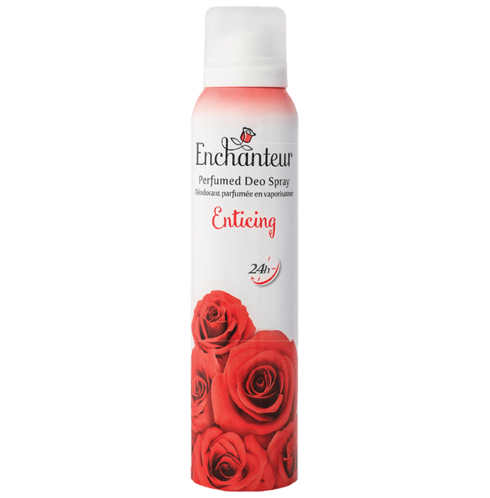Enchanteur Perfumed Deo Spray Enticing is an enticing deodorant spray designed for women that has a flowery essence. It is gentle on the skin and offers lasting freshness by fighting body odour. It has a refreshing aroma to uplift the mood. | Key Ingredients: Ethanol Propellent hydrocarbon (Butane, Isobutane, Propane) Fragrance PPG-20 Methyl glucose ether Propylene glycol | Key Benefits: This feminine spray may spread floral and lasting fragrance It is a skin-friendly enticing deodorant that can be suitable for the sensitive skin of women This feminine body spray combats odour and refreshes the mood instantly | Directions For Use: Shake well before use Hold 15 cm away from the body and spray | Safety Information: Read the label carefully before use Store in a cool and dry place away from direct sunlight Keep out of reach of children