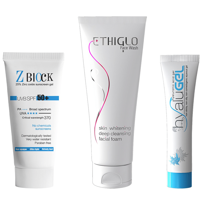 Ethicare Remedies Combo Pack of Ethiglo Face Wash 70ml, Z Block UVB SPF 50+ Sunscreen Gel 50ml & Hyalugel 30gm contains a face wash, a sunscreen gel and Hyalugel. The face wash removes dark spots and dead skin, Z Block protects against harmful rays and Hyalugel enhances blood circulation. | Key Ingredients: | Ethiglo Face Wash: Aqua Stearic acid Coco Fatty acid Lauric acid globules Liquorice extract Phenoxyethenol (and) Ethylheyglycerin Niacinamide Sodium PEG-7 olive oil Carbovylate Sodium hydroxide Salicylic acid Triclosan Allantoin D- Panthenol Disodium EDTA Glycolic acid Lactic acid Vitamin E Vitamin C Postassium Hydoxide Perfume | Z Block UVB SPF 50: Zinc Oxide | Hyalugel: Aqua Glycerin Hyaluronic acid Carbomer Preservatives | Key Benefits: | Ethiglo Face Wash: It helps in removing dark spots and dead skin It is an effective cleanser It improves complexion and skin tone | Z Block UVB SPF 50: It is dermatologically tested It is free of chemical actives | Hyalugel: It is the most suitable moisturizer and conditioner for oily and acne-prone skin It is suitable for sensitive skin too It is a non-sticky, non-comedogenic, hypoallergenic, safe from colour and fragrance gel It enhances the result of cosmetic procedure It enhances blood circulation, reduces pore size and makes your skin baby-soft It has excellent spread ability | Directions For Use: Use as directed. | Safety Information: Read the label carefully before use Store in a cool and dry place away from direct sunlight Keep out of reach of the children