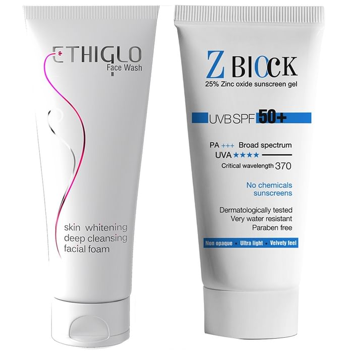 Ethicare Remedies Combo Pack of Ethiglo Face Wash 70ml & Z Block UVB SPF 50+ Sunscreen Gel 50ml Ethicare Remedies Combo Pack of Ethiglo Face Wash 70ml & Z Block UVB SPF 50+ Sunscreen Gel 50ml includes a face wash and a sunscreen gel. While the face wash removes dead skin, the sunscreen protects against UVA and UVB rays.