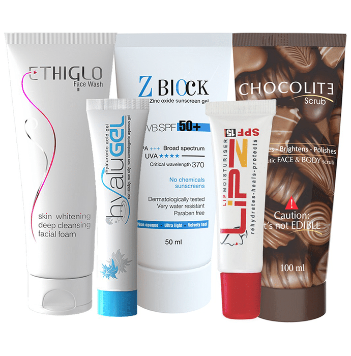 Ethicare Remedies Skincare Regimen Kit contains Ethiglo Face Wash, Hyalugel, Chocolite Scrub, LipzLip Moisturizer and Z Block Sunscreen. It is the ideal kit for treating your skin and keeping it clean and moisturized. | Key Ingredients: | Ethiglo Face Wash: Kojic Acid - 1% Vitamin C – 0.5% Liquorice – 1% Nicotinamide – 0.5% Blend of AHA & BHA – 1.5% Triclosan Vit E, D-Penthenol – 0.5% | Hyalugel: Aqua Glycerin Hyaluronic acid Carbomer Preservatives | Chocolite Scrub: Natural extracts | LipzLip Moisturizer: Squalene Mineral Oil Kokum Butter Shea butter Sun filters Silicon Oil | Z Block Sunscreen: Zinc oxide | Key Benefits: | Ethiglo Face Wash: It helps in removing dark spots and dead skin It is an effective cleanser | Hyalugel: It is the most suitable moisturizer and conditioner for oily and acne-prone skin It is suitable for sensitive skin too It is a non-sticky, non-comedogenic, hypoallergenic, safe from colour and fragrance gel It enhances the result of cosmetic procedure It enhances blood circulation, reduces pore size and makes your skin baby-soft It has excellent spread ability | Chocolite Scrub: It moisturizes, rejuvenates and nourishes the skin It lessens wrinkles and blemishes It tightens loose skin and leaves it soft and smooth | LipzLip Moisturizer: It helps in treating chapped, dry and cracked lips It has a non-irritant base It is fragrance-free | Z Block Sunscreen: It is dermatologically tested It is free of chemical actives | Directions For Use: Use as directed | Safety Information: Read the label carefully before use Store in a cool and dry place away from direct sunlight Keep out of reach of the children