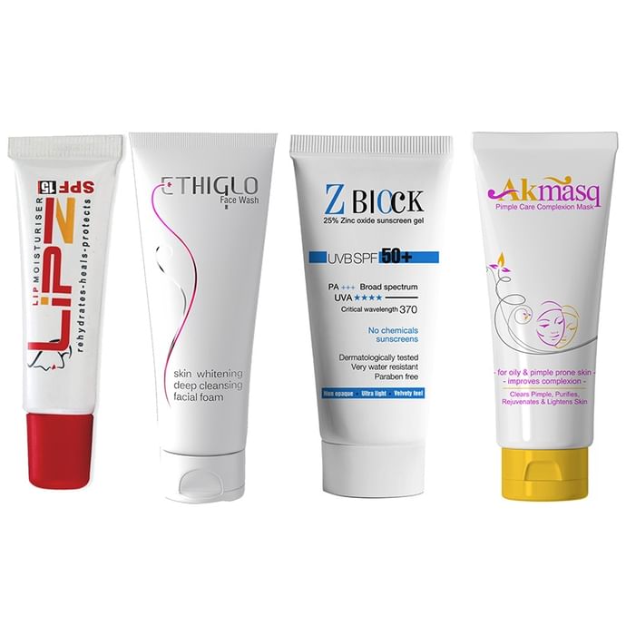 Ethicare Remedies Summer Skin Care Kit includes Z Block Sunscreen Gel, Ethiglo Skin Whitening Face Wash, Akmasq Pimple Care Complexion Mask and LipzLip Moisturizer. The products help to remove dark spots and give a soothing effect to the skin. | Key Ingredients: | Z Block Sunscreen Gel: Zinc oxide | Ethiglo Skin Whitening Face Wash: Aqua Stearic acid Coco Fatty acid Lauric acid globules Liquorice extract Phenoxyethenol (and) Ethylheyglycerin Niacinamide Sodium PEG-7 olive oil Carbovylate Sodium hydroxide Salicylic acid Triclosan Allantoin | Akmasq Pimple Care Complexion Mask: Tea tree oil Sandalwood Turmeric Pro-Vit. B5 Cucumber | LipzLip Moisturizer: Squalene Mineral oil Kokum butter Shea butter Silicon Oil | Key Benefits: | Z Block Sunscreen Gel: It is dermatologically tested It is free of chemical actives | Ethiglo Skin Whitening Face Wash: It helps in removing dark spots and dead skin It is an effective cleanser It improves complexion and skin tone | Akmasq Pimple Care Complexion Mask: It helps to absorb oil It gives a soothing effect to the skin | LipzLip Moisturizer: It moisturizes dry and chapped lips It heals and protects lips | Directions For Use: Use as directed. | Safety Information: Read the label carefully before use Store in a cool and dry place away from direct sunlight Keep out of reach of the children