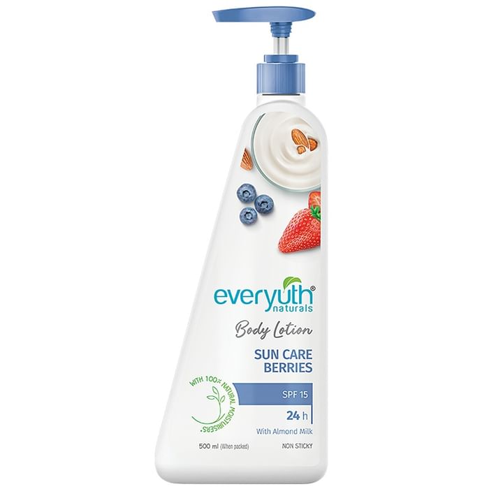 Everyuth Natural Body Lotion Sun Care Berries SPF 15 can help protect the body against harmful UVA and UVA rays of the sun. It can help moisturise the skin and prevent dryness. It also long lasting with a quick absorption formula | Key Ingredients | : Extract blend Prunus amygdalus 10 mg Flaxseed (Alsi) Linseed 2.5 mg Blend of mulberry 2.5 mg Strawberry fruit extract Glycerine Perfume Base material Q.S | Key Benefits | : Added SPF 15 helps provide sun care and protection from harmful UVA and UVB rays The union of blended berries offers a radiant glow to your skin The special long-lasting formula keeps your skin moisturized and nourished for up to 48 hours Enriched with 100% almond milk to combat dryness and hydrate the skin It has a quick-absorbing and non-sticky formulation Helps make the skin texture soft and supple | Direction For Use: Apply daily all over the body for smooth and soft skin. | Safety Information: Store in a cool and dry place away from direct sunlight Only meant for external use Read the label carefully before use