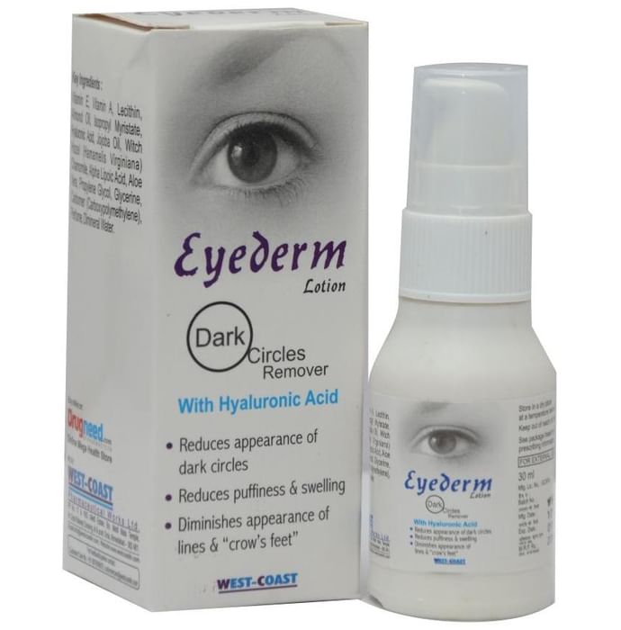 Eyederm Dark Circle Remover Lotion Eyederm Dark Circle Remover Lotion is a lotion formulated to reduce pigmentation and dark circles. It contains ingredients like almond oil, aloe vera and jojoba oil which help in the nourishment of the eye. It helps to retain moisture content of the eye and decreases swelling or puffiness that occurs due to infections. The organic molecules help in maintaining the tightness of the skin and softens the skin. It helps in reducing tiredness of the eye muscles.