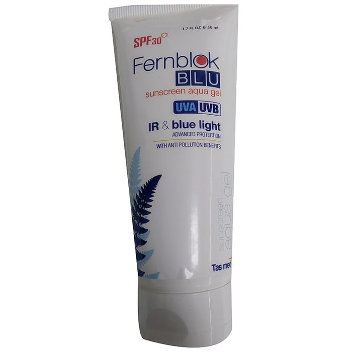 Fernblok BLU Sunscreen Aqua SPF 30 Gel is a lightweight solution with SPF 30+ that shields individuals from the harmful UVA and UVB radiation that can harm skin tissue. This sunscreen shields your skin from sunburn while also making UV damage, blemishes, acne, and dark patches less obvious. Additionally, it aids in avoiding wrinkling and sagging skin. Your skin will be soothed, protected from early ageing, and brightened by the natural components. This lotion also helps to maintain skin tone, giving the illusion of healthy, even skin tone. | Key Ingredients: Fruit extracts Sunflower seed extracts Niacinamide Aloe vera Papaya extract | Key Benefits: This sunscreen lotion helps to keep the skin hydrated, nourished, and protected from sun damage It may remove tan and dark spots and gives you clear skin It consists of ingredients that protect the skin from environmental pollutants | Directions For Use: Apply evenly onto your skin before stepping out in the sun | Safety Information: Read the label carefully before use Store in a cool and dry place, away from sunlight Keep out of reach of children
