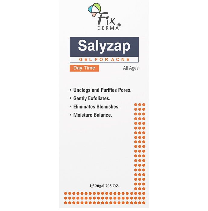 Fixderma Salyzap Gel For Acne Day Time Fixderma Salyzap Gel For Acne Day Time helps to reduce acne breakouts by lowering excess oil production. Salicylic acid purifies and exfoliates the skin, enhancing its health by eliminating debris, germs, and filth from the skin's surface. Nicotinamide is also present, which helps to preserve the skin's lipid barrier, shrink pores, and protect against sun damage.