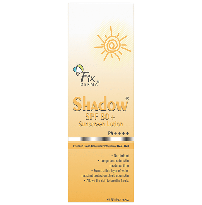 Fixderma Shadow Sunscreen Lotion SPF 80+ Fixderma Shadow Sunscreen Lotion SPF 30+ aids in the prevention of UV damage to the skin, such as wrinkles, fine lines, and sunspots. It protects skin from UVA and UVB radiation, which helps to alleviate redness, irritation, and skin inflammation. It contains Cyclomethicone, which improves the skin's texture and sensory feel while also reducing irritation and the appearance of dryness. It also contains vitamin E, which functions as an antioxidant and acts as a natural moisture barrier on our skin.