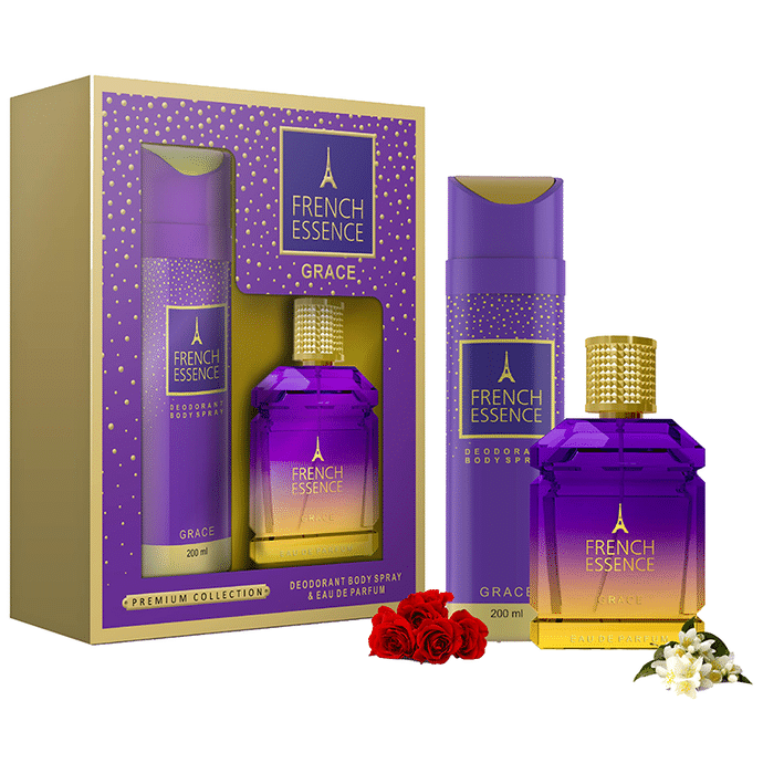 French Essence Perfume & Deodorant Gift Set for Women is a gift set containing bloom deodorant and perfume with top notes of citrus with aromatic lavender and bergamot, floral mid notes of geranium and a musky base note of musk, moss and amber. This long-lasting fragrance uplifts your mood and makes you feel special. It is suitable for daytime and nighttime use. | Key Ingredients: Lavender Bergamot Geranium Musk Moss Amber | Key Benefits: It uplifts mood and energises the spirits Its unique fragrance lasts long and adapts to the Indian climatic conditions and skin type It keeps you smelling fresh all day long It is a versatile fragrance that can be used for all occasions | Directions For Use: Use as directed on the label | Safety Information: Read the label carefully before use Store in a cool and dry place, away from sunlight Keep out of reach of children