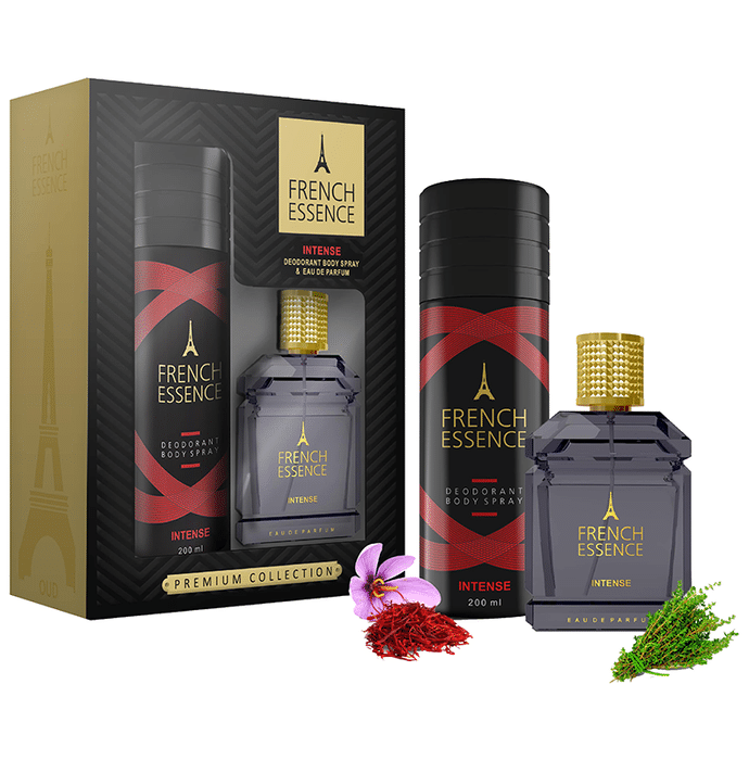 French Essence Intense Deodorant Body Spray 200ml & Perfume 60ml Gift Set for Men is the perfect gift set for your loved ones. It has the top notes of saffron, lemon, and bergamot, middle notes of leather, oakmoss, coriander, and base notes of sandalwood, cedarwood and amber. This woody, musky fragrance radiates confidence and charm and works perfectly for meetings, brunch, dinner and parties. It is the perfect blend of power and passion. | Key Ingredients: Saffron Bergamot Leather Oakmoss Sandalwood Cedarwood | Key Benefits: The fragrance adds confidence and charm to your personality With a mix of body spray and perfume, this gift set is ideal for the day as well as night It keeps you smelling like a dream all day long It is specially crafted for special occasions | Directions For Use: Use as directed on the label | Safety Information: Read the label carefully before use Store in a cool and dry place, away from sunlight Keep away from direct flame