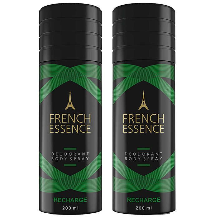 French Essence Recharge Deodorant Body Spray (200ml Each) French Essence Recharge Deodorant Body Spray is the ideal everyday fragrance. It is formulated with extracts of exotic bergamot, rare Moroccan jasmine, and oakmoss to give you a feeling of wild open spaces. It has balanced earthy and woody tones that make you feel free-spirited.