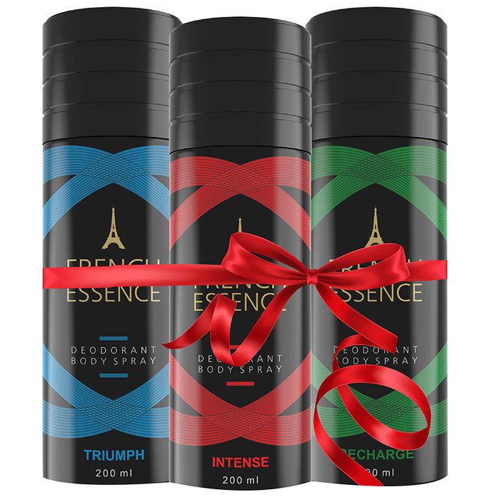 French Essence Triumph Deodorant Body Spray (200ml Each) is a cooling and refreshing fragrance for both men and women. It has top notes of rosemary balanced with the middle notes of coriander and the spicy tones of cedarwood. It gives you a feel of the Mediterranian seas that enhances mood and boosts confidence. | French Essence Intense Deodorant Body Spray (200ml Each) is the perfect everyday fragrance to intensify your spark. It is formulated with extracts of saffron, oakmoss, coriander, sandalwood, and cedarwood, giving it a rich, woody, and musky scent. | French Essence Recharge Deodorant Body Spray (200ml Each) is the ideal everyday fragrance for the adventurous ad the wild spirited. It has balanced earthy and woody tones that make you feel free-spirited. It is formulated with exotic extracts of exotic bergamot, rare Moroccan jasmine, and oakmoss to give you a feeling of wild open spaces. Key Ingredients: Intense- Saffron Oakmoss Corainder Sandalwood Cedarwood Triumph- Rosemary Coriander Cedarwood Recharge- Bergamot Moroccan jasmine Oakmoss | Key Benefits: It helps to eliminate body odour and keeps you fresh all day long The cooling fragrance adapts to Indian climate and skin It is a lightweight and fresh, and cool fragrance that lasts a long time | Directions For Use: Use as directed on the label | Safety Information: Read the label carefully before use Store in a cool and dry place, away from sunlight Keep away from direct flame