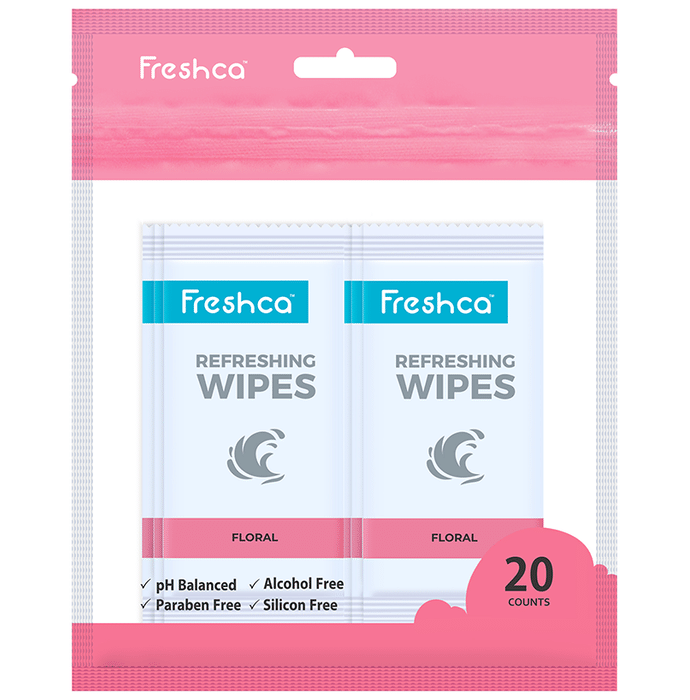 Freshca Refreshing Wipes Floral provides the sweet floral fragrance that eliminates all contaminants from the skin, giving it the nourishment it requires. | Key Ingredients: Deionized water Glycereth-26 PEG-50 shea butter Polysorbate 20 Propylene glycol Di-sodium EDTA Preservative Fragrance | Key Benefits: It clears off dirt and impurities from the skin It helps maintain the moisture balance of the skin It has a mild fragrance It gently cleanses and refreshes the skin | Directions For Use: Tear off single sachet and wipe gently to cleanse the hand, face and neck area Carefully dispose of after use | Safety Information: Read the label carefully before use Store in a cool dry place away from direct sunlight Keep out of reach of the children