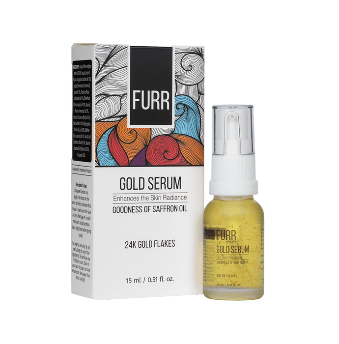 Furr 24K Gold Serum Furr 24K Gold Serum A great companion for rejuvenating facial massages. Introducing FURR's 24k Gold Serum, with a nutritional blend of 24k gold flakes, saffron oil, sea buckthorn oil and sandalwood oil. The serum helps increase collagen in the skin, which makes the skin more firm, even-toned skin and radiant. It also fights the signs of ageing like fine lines, wrinkles and age spots.
