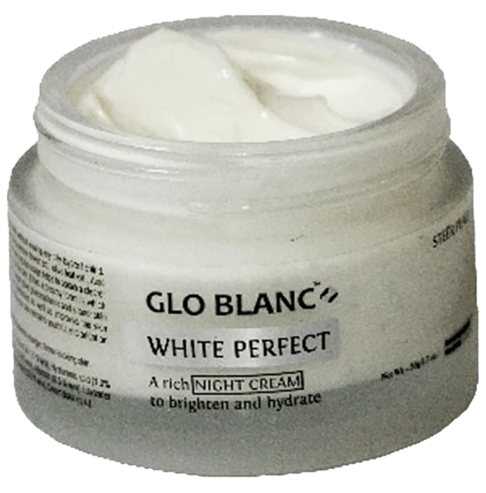 Glo Blanc White Perfect Night Cream Glo Blanc White Perfect Night Cream is a non-greasy skin lightening cream which helps you in obtaining a clearer skin by reducing dark spots, and moisturises the skin well, keeping it soft and supple. It is highly useful for people with stubborn acne spots and melasma and effectively minimizes the damage caused by the sun.