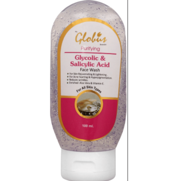 Globus Purifying Glycolic & Salicylic Acid Face Wash Globus Purifying Glycolic & Salicylic Acid Face Wash which not clog your pores. Glycolic acid also removes dead skin cells and reduces inflammation related to acne. Glycolic acid improves skin texture and diminishes wrinkles. Salicylic acid helps in treating acne. Salicylic acid works by reducing the number of dead skin cells that are trapped inside the pores and prevents the pimples formation.