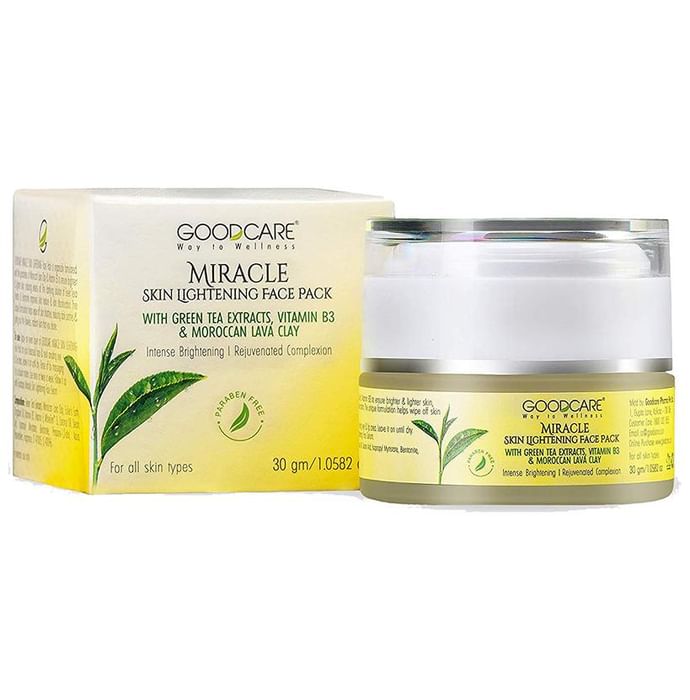 Goodcare Miracle Skin Lightening Face Pack Goodcare Face Pack Purifying Face Pack helps to detox and cleanse the face giving an instant natural rejuvenation in a short span of time. It is purely hand crafted using specially handpicked ingredients which gives an infused cooling effect. Green Tea have shown to function as anti-inflammatory for the skin. It helps to rejuvenate and revitalize the skin.