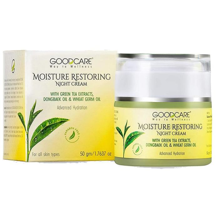 Goodcare Moisture Restoring Night Cream promotes a natural night time purification process and provides a fresh looking skin. Formulated with Wheat-germ Oil and other natural ingredients, it promotes a radiant and even complexion targeting multiple signs of skin damage. | Key Ingredients: Green tea extracts Dongbaek Oil Wheat Germ Oil | Key Benefits: Helps in hydrating the skin and provides extra-nourishment and replenishment to the skin Restores hydration, firmness and elasticity and makes the skin bright over time with more defined and natural skin Green tea is antioxidant by nature, have also been shown to function as anti-inflammatory Wheat Germ Oil is high in nutrients and essential fatty acids which helps to regenerate tissue and lubricate the skin | Directions For Use Use as directed by the health-care professional. | Safety Information: Read the label carefully before use Store in a cool dry place away from direct sunlight Keep out of reach of the children Do not exceed the recommended dosage