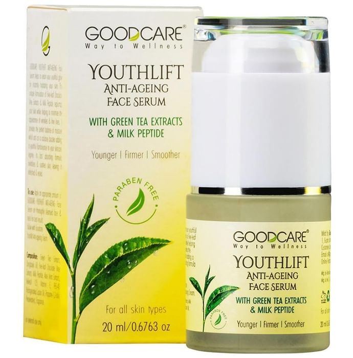 Goodcare Youthlift Anti-Ageing Face Serum Goodcare Face Serum rejuvenates the skin and helps in hydrating the face effectively reducing the dark spots over time. The combined goodness of Green Tea Extracts and other ingredients visibly reduces hyper-pigmentation giving a velvety smooth touch to deliver you a flawless skin. It is available in variants :-Youthlift Anti-Ageing, Spot Anti- Pigmentation, Miracle Skin Lightening, Purifying Anti-Acne.