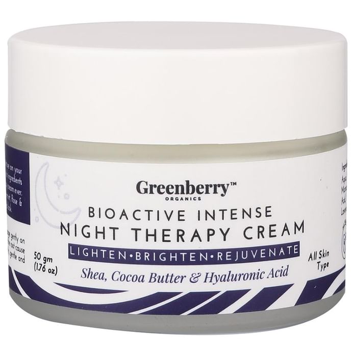 Greenberry Organics Bio-Active Intense Night Therapy Cream Greenberry Organics Bio-Active Intense Night Therapy Cream made with the evergreen rich ingredients like cocoa and shea butter. Filled with the essence of skin food oils like Almond, Peppermint, Rose & Lavender, it works on pigmentation and give a brightened look.