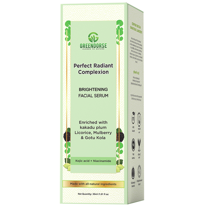 Greendorse Brightening Facial Serum addresses skin problems with its unique formulation. This lightweight serum is full of natural ingredients that promise to minimise the appearance of dark spots and impart a luminous look on the skin, and it's safe for even the most sensitive skin types. | Key Ingredients: Kakadu plum Liquorice extract Mulberry extract Gotu kola Moringa Papaya Apple cider vinegar | Key Benefits: It may help to delay the process of ageing and reduces the fine lines It reduces melanin formation and helps to lighten the complexion and skin darkening It helps to brighten, smoothen and improve the texture of the skin | Directions For Use: Use as directed on the label. | Safety Information: Do not exceed the recommended dosage Store in a cool and dry place away from direct sunlight Keep out of reach of children