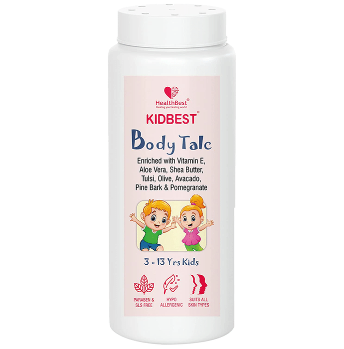 HealthBest Kidbest Body Talc is a nutrient-rich body powder that is perfect for itchy, cracked, rashes, damaged or irritated skin. It is especially beneficial to use during summers, as it is easy for kids to get rashes and itchy skin while playing outdoors, due to excess moisture. The powder avoids excess moisture on the skin that can cause other issues such as a rash from diapers. The formulation is free from toxic chemicals and is gentle for kids’ mild skin. | Key Ingredients: Vitamin E Tulsi Neem Aloe vera 200x Perfume Avocado oil Olive extract Shea butter Pomegranate extract Pine bark extract Talc Starch Sodium Benzoate Silica | Key Benefits: The Kidbest body talc is a gentle, nutrient-rich dusting powder that's good for the skin This skin powder is perfect for sensitive, irritated, itchy, rash skin during summers Ideal for areas that collect sweat like waistbands, panty liners, and underarms and back Useful, especially for children in summers as it is easy for children to get rashes | Directions For Use: Shake powder directly into your hand away from the face and smooth onto the skin. Close tightly after use. | Safety Information: For external use only Avoid contact with eyes. If eye contact occurs, rinse thoroughly with water Store in a cool and dry place away from direct sunlight Keep out of reach of children except under adult supervision