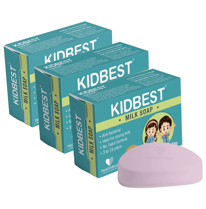 HealthBest Kidbest Milk Soap (75gm Each) HealthBest Kidbest Milk Soap is an all in one product that can be used for both, the face and the body. The Kidbest milk soap works well and cleans the skin without leaving it dry and itchy. It is a great moisturising soap for men, women, kids and babies. It is formulated with nutritious ingredients like olive oil, coconut oil, aloe vera, oat milk and vitamin E. It contains therapeutic healing properties and is naturally derived, so it can also be used as anti-itch soap for children. Natural skin care products by Kidbest are absolutely as pure as can be. It is made up of the finest all-natural ingredients to blend the soap bars that are gentle enough for young sensitive skin.