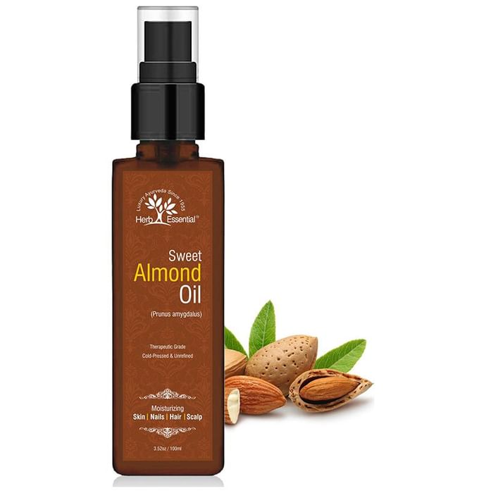 Herb Essential Therapeutic Grade Cold Pressed & Unrefined Sweet Almond Oil is good for moisturising the skin, nails, hair and scalp. The oil is rich in vitamins and is used for multi-purpose. | Key Ingredient: Pure Almond Oil (prunus amygdalus) | Key Benefits: Oil is rich in vitamin A and E. It nourishes and improves complexion-reviving its natural glow Useful for lightening dark circles, spots and marks on the skin and can be used even on delicate, irritated or sensitive skin types Smoothens hair cuticles, helps to control hair fall and adds lustre to damaged hair Almond oil is ideal as baby massage oil as it nourishes and moisturises the baby skin | Directions For Use: Use topically on hair, face and body by applying 2-3 drops or as needed into palms and massage as needed. | Safety Information: Keep away from sensitives area For external use only Read the label carefully before use Keep out of the reach of children Should be protected from direct light Avoid the contact with eyes In case of contact with eyes, remove with water immediately