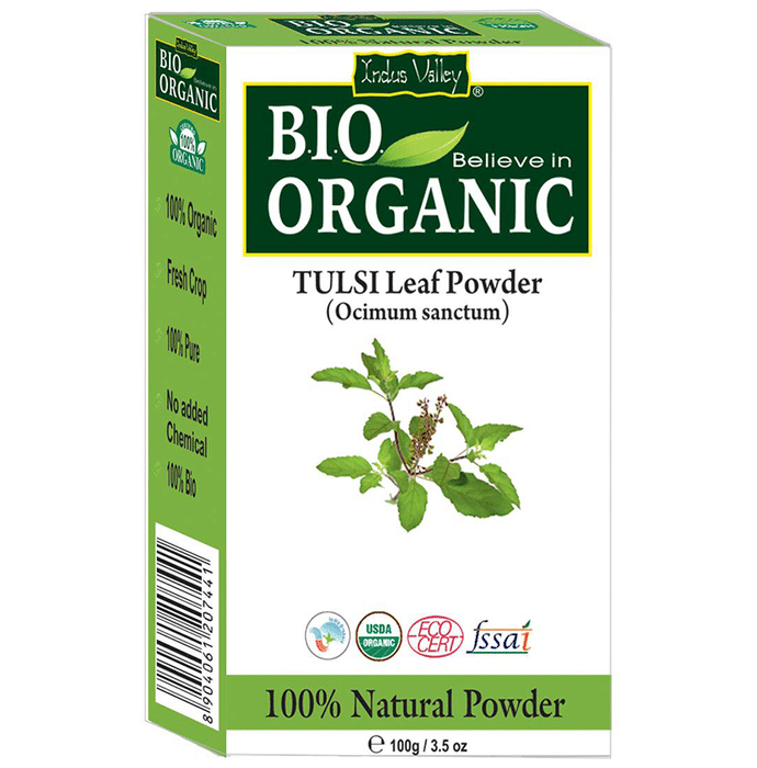 Key Ingredients of Indus Valley Bio Organic Tulsi Leaf Powder: Tulsi | Key Benefits of Indus Valley Bio Organic Tulsi Leaf Powder: Considered an effective remedy against several hair issues A triple sifted microfine multipurpose powder which suits all skin and hair types This tulsi powder is completely free from all kinds of chemicals or preservatives and safe to use Owing to its nutritional properties, it is widely used as an important beauty ingredient Tulsi Powder is best for getting relief from itchy scalp and skin Also very effective against bursting scars, pimples, and other breakouts It also helps in removing dirt and impurities, helps in opening clogged skin pores, and also controls excessive segregation of oil from the skin This powder helps in tightening the pores and improving skin structure Fights against scalp infections and helps in getting rid of hair fall