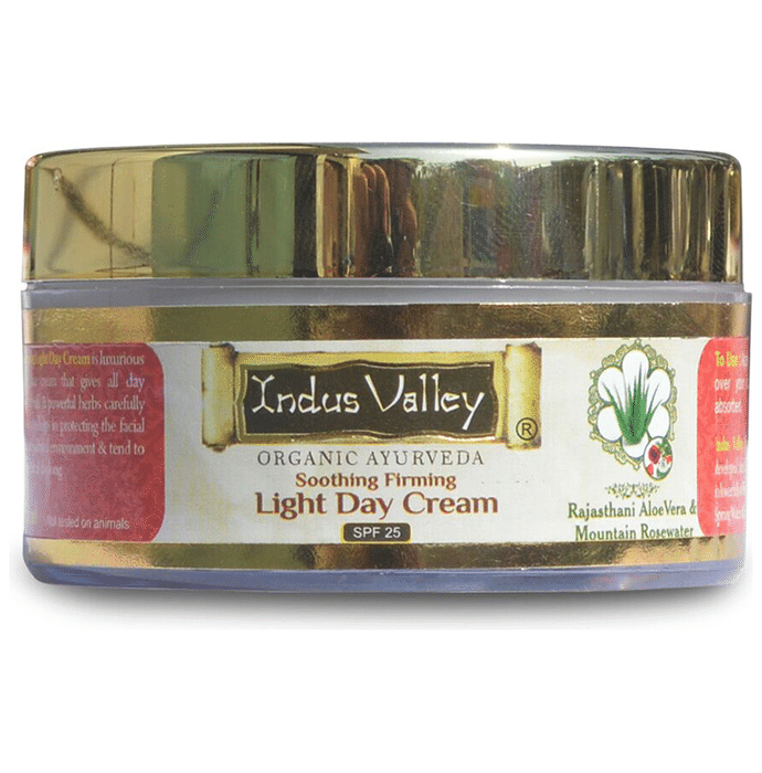 Key Ingredients of Indus Valley Organic Ayurveda Cream Soothing Firming Light Day: Rajasthani Aloe vera Rosewater | Key Benefits of Indus Valley Organic Ayurveda Cream Soothing Firming Light Day: Indus Valley’s Soothing Firming Light Day Cream is an innovative blend of 8 exotic magical skincare botanicals such as Aloe Vera, rose water, sesame oil, wheat germ oil, jojoba oil, grapeseed oil and neroli oil The cream is made by natural extraction processes using natural extracts; hence it is free from paraben, resorcinol and harmful chemicals The light day cream helps to protect skin from both UVA and UVB rays of the sun and provides relief from long-lasting tan when applied regularly Extremely lightweight and non-sticky in texture, the product provides deep nourishment and hydration by exfoliating dead skin and opens clogged pores It works wonders on wrinkles, fine lines, dark spots and suntan Its amazing properties soothe blemishes, acne, pimples and tone up the skin