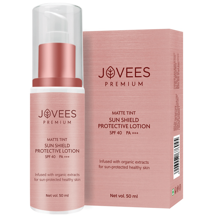 Jovees Matte Tint Sun Shield Protective Lotion SPF 40 PA+++ is an oil-free, lightweight lotion that protects your skin from UVA and UVB rays, increases elasticity, evens skin tone, and leaves a matte finish. It is a broad-spectrum sun protection lotion that offers SPF40 PA+++ protection and aids in the restoration of the skin. It contains aloe vera and can help improve skin complexion by reducing red patches and blemishes. It contians carrot seed oil that manages skin damage, tightens skin to prevent drooping, and tones muscles and tissue. This lotion also improves the skin's health, decreases redness, and delays the onset of wrinkles due to wheat germ oil, which high in vitamins B6 and E; a powerful antioxidant. | Key Ingredients: Aloe vera extract Carrot seed oil Wheat germ oil | Key Benefits: It is a broad-spectrum sun protection lotion with SPF40 PA+++ that protects your skin against UVA and UVB rays It has aloe vera that brightens and lightens the skin by reducing red spots and blemishes It contains carrot seed oil that manages skin damage, tightens skin to prevent sagging, and tones muscles and tissue It also has wheat germ oil that is high in Vitamins B6 and E, making it an effective antioxidant that improves skin health, decreases redness, and delays the onset of wrinkles This oil-free, lightweight lotion increases elasticity, evens skin tone, and leaves a matte finish | Directions For Use: Cleanse your face using a face wash, followed up with a toner Take a small quantity of the lotion on your palm Apply all over face and neck twice a day and leave on | Safety Information: Read the label carefully before use Store in a cool and dry place, away from sunlight Keep out of reach of children