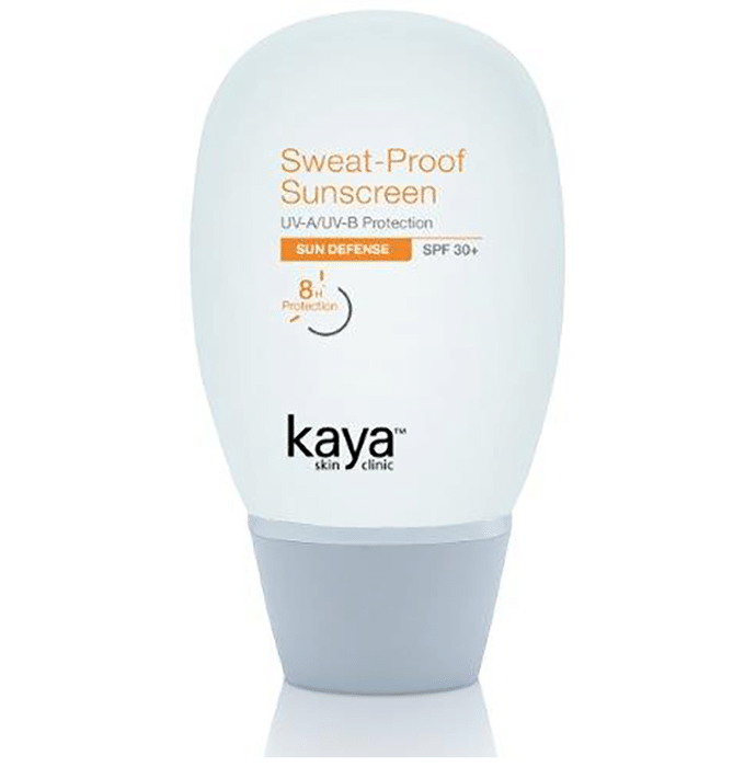 Kaya Sweat Proof Sunscreen SPF 30 Kaya Sweat Proof Sunscreen SPF 30 is a water and sweat-resistant sunscreen delivering up to 8-hour broad-spectrum protection against harmful UV-A and UV-B rays. A light white colored cream that leaves the skin with a smooth silky after-feel, and keeps it protected for long. Aloe barbadensis leaf juice soothes skin and serves as an anti-inflammatory agent. The antioxidant Vitamin E- Tocopheryl Acetate helps in lightening of the skin.