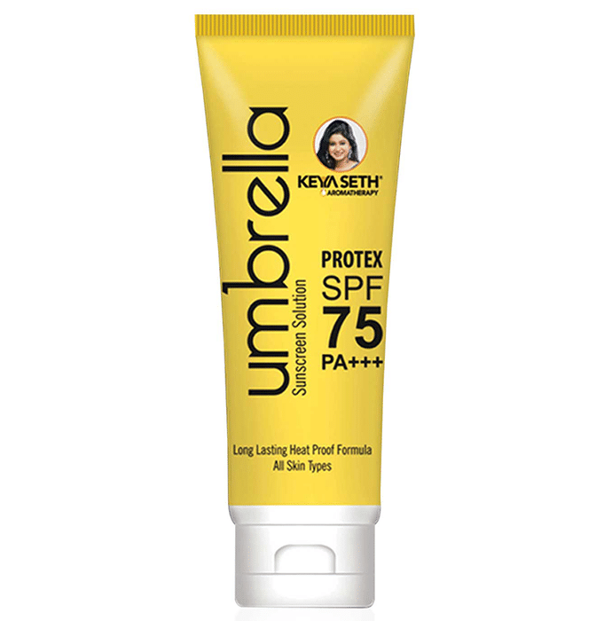 Keya Seth Aromatherapy Umbrella Sunscreen Solution is a revolutionary sunscreen product with SPF 75, PA+++ and protex for complete protection against harmful UV radiation and ambient heat. Sodium hyaluronate and other skin-nourishing substances maintain skin healthy and supple by preventing moisture loss due to heat. Protex, a specially formulated compound, creates a barrier of mica and silica on the skin, which works as a protective shield from atmospheric heat. Sodium hyaluronate is a compound that improves natural moisture retention in the skin. It is a compound that gives thermal protection to the skin and keeps it safe from heat damage too. | Key Ingredients: Carrot seed oil Raspberry seed oil Wheat germ oil Lavender essential oil Micronized talc Titanium Di Oxide Micronized zinc oxide Sodium hyaluronate Glycerin | Key Benefits: The Sunscreen Solution with SPF 75 and PA+++ offers broad-spectrum sun protection against UVA and UVB rays It aids to create a shield that prevents thermal and free radical damage Its sweat-resistant formula keeps skin hydrated yet oil-free while absorbing UV rays This sunscreen contains soothing sandalwood oil that helps to prevent sunburn and sun damage It helps to prevent loss of moisture due to heat, keeps skin hydrated and nourished | Directions For Use: Apply the non-greasy sunscreen gently on the face, neck and other exposed body areas, especially 15 minutes before going out in the sun and cooking. | Safety Information Protect from direct sunlight, heat and moisture Do not exceed recommended dosage Do not use if seal is broken Keep out of reach of children Store in a cool, dark and dry place