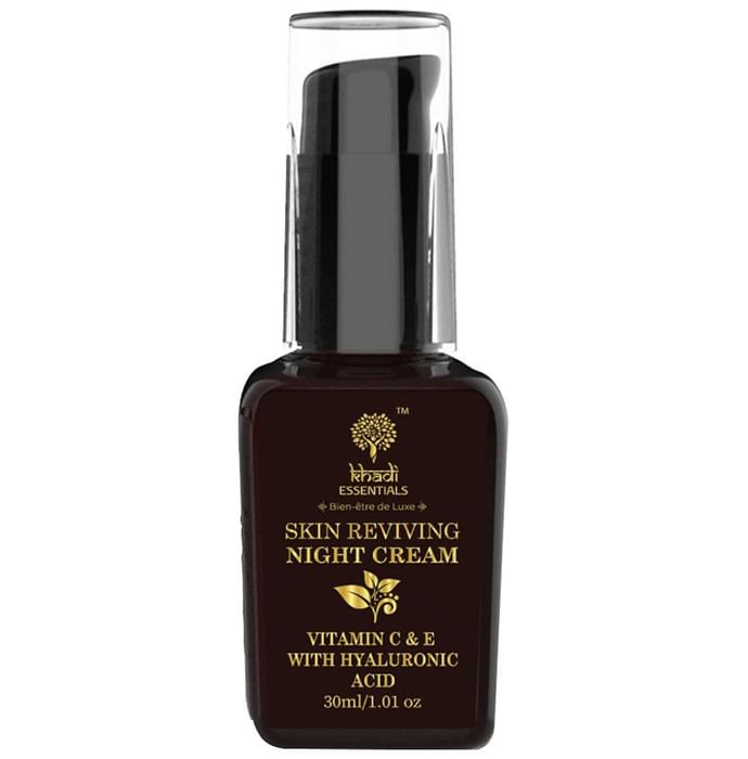 Khadi Essentials Skin Reviving Night Cream has been formulated to moisturize the skin and keep it soft and supple | Key Ingredients Jojoba oil Vitamin C Vitamin E Green tea extract | Key Benefits: It is non-greasy and gets absorbed easily It helps improve the texture of the skin and makes it soft and glowy It soothes inflammation It helps prevent dryness It helps to prevent the skin from becoming wrinkled | Directions For Use: Use as directed on the label | Safety Information: Keep out of reach of children Store in a cool and dry place Read the label before use