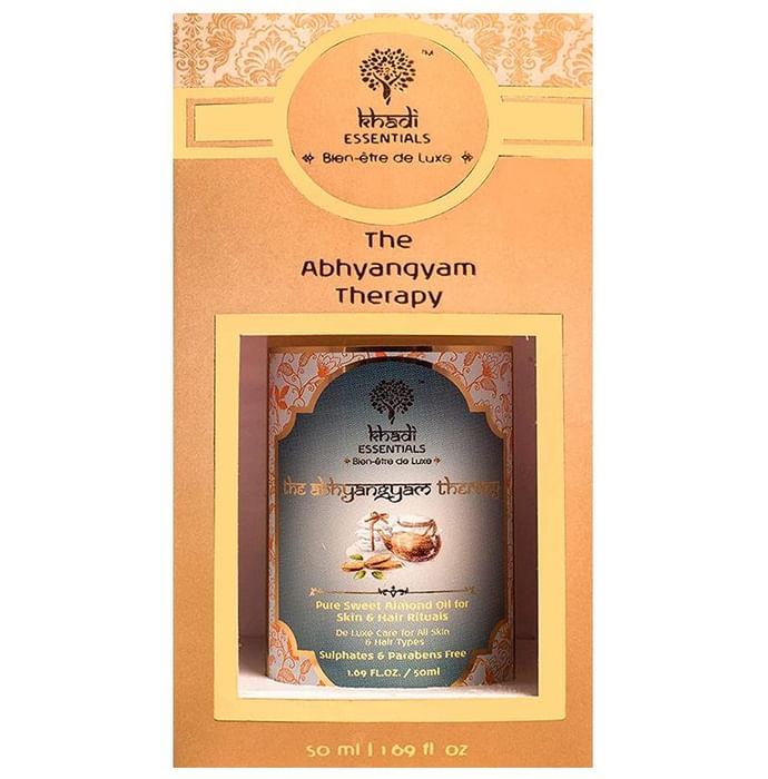 Khadi Essentials The Abhyangam Therapy Pure Sweet Almond Oil is a nourishing and moisturising agent that leaves the skin feeling soft, smooth and resilient. Reduces fine lines and other signs of ageing and prevents hair loss itching and fights dark circles. | Key Ingredients: Pure Sweet Almond Cold Pressed Oil | Key Benefits: Invigorates energy and removes toxins from the skin Deeply moisturises and nourishes parched skin Improves skin's texture and adds radiance Fortifies hair and scalp health Formulated for providing luxurious care for all skin and hair types | Directions For Use: Use as directed by the physician. | Safety Information: Read the label carefully Store in a cool and dry place Keep out of the reach of children