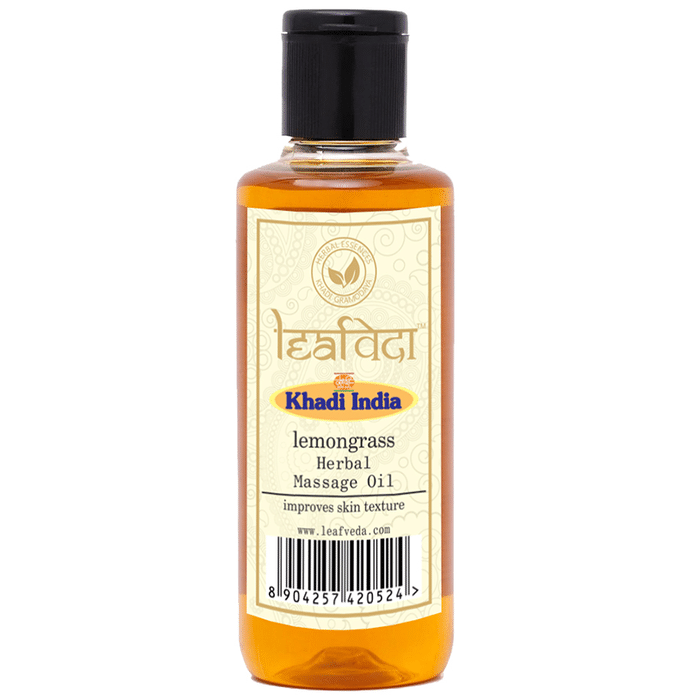 Khadi Leafveda Lemongrass Herbal Massage Oil is a wonderful body massage oil from khadi that uplifts the mood and stimulates the senses. | Key Ingredients: Lemongrass Sesame oil Castor oil Coconut oil Mentha oil Almond oil Mustard oil Sunflower oil | Key Benefits: Lemongrass is a wonderful body massage oil which nourishes and soothes the skin Aroma of lemongrass stimulates the senses Embodies antiseptic, astringent, and anti-depressant properties The oil is useful in the case of acne and greasy skin | Directions For Use: Pour few drops of oil Massage well onto the body Rinse after few hours | Safety Information: For external use only Store in a cool and dry place Read the label carefully before use Keep out of the reach of children Should be protected from direct light Avoid the contact with eyes In case of contact with eyes, remove with water immediately