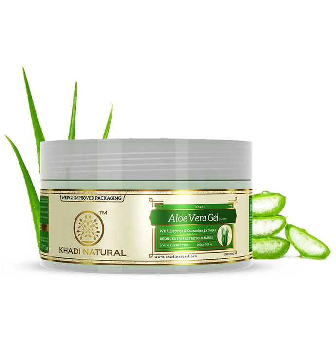 Khadi Naturals Ayurvedic Aloevera Gel with Liqorice & Cucumber Extracts Green Khadi Naturals Ayurvedic Aloevera Gel with Liqorice & Cucumber Extracts moisturizes the skin without giving it a greasy feel, perfect for those with oily skin. It makes skin clean and healthy and also prevents breakouts.