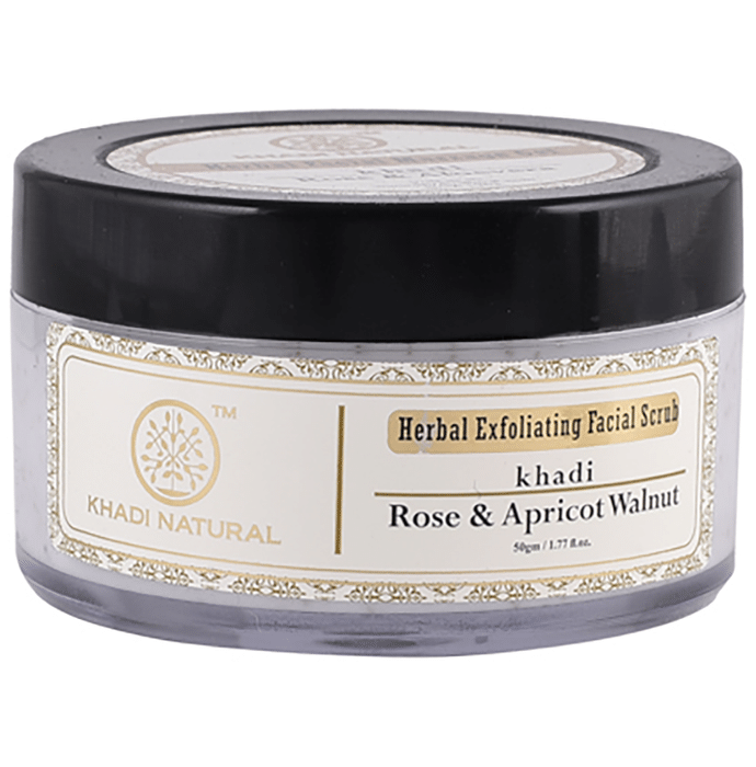Khadi Naturals Rose, Apricot & Walnut Herbal Exfoliating Facial Scrub It exfoliates the skin to help remove dead and dried cells and reveal the youthful, fresh, and glowing skin present underneath. It helps with the lifelessness and dullness of the skin. | Key Ingredients: Papaya extract Rose water Almond Wheat germ Jojoba oil Olive oils Shea butter Cocoa butter Glycerin Aloe vera | Key Benefits: It gently exfoliates while unclogging pores, removing impurities, and getting rid of tan It leaves the skin looking soft, supple and fresh The scrub exfoliates dead skin and other impurities and lets the skin breathe It is also high in anti-inflammatory and healing properties | Directions For Use: Use as directed on the label or as advised by your healthcare provider | Safety Information: Read the label carefully before use Store in a cool and dry place away from direct sunlight Keep out of reach of children