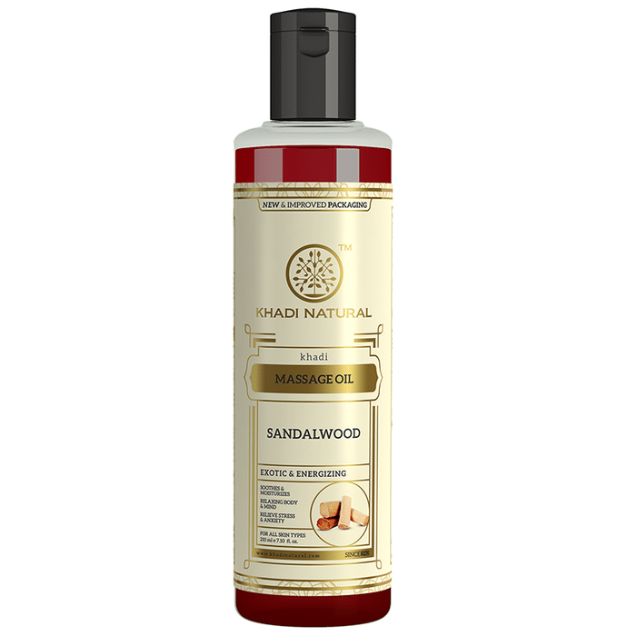 Khadi Naturals Sandalwood Herbal Massage Oil Plain Khadi Naturals Ayurvedic Sandalwood Massage Oil Paraben Mineral Oil Free relax and pamper you with its herbal base. It nourishes and rejuvenates your skin. It takes care of your skin texture and protects it from shrinking. This unique oil also give relief from body ache.
