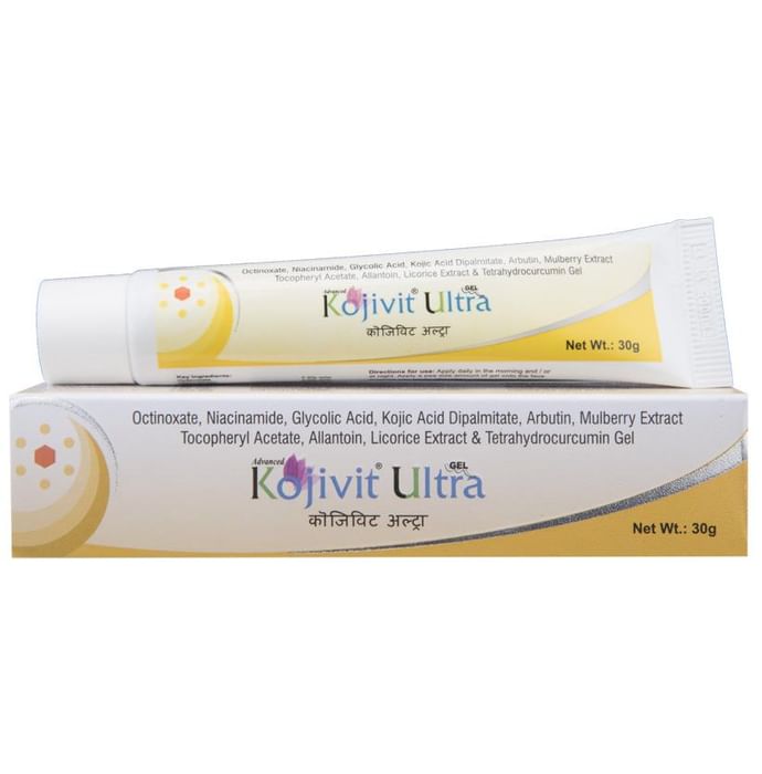 Kojivit Ultra Gel Kojivit Ultra Gel contains Allantoin, Arbutin, Glycolic acid, Kojic acid, Liquorice extract, Mulberry extract, Octinoxate, Niacinamide, Tetrahydrocurcuminoids, and Tocopherol acetate as active ingredients. Key benefits/uses of Kojivit Ultra Gel: - Kojic Acid is a whitening and oxidizing agent which penetrates through the skin and oxidizes the melanocytes thereby lightens the complexion of skin. - Arbutin acts as a skin- lightening agent and prevents the formation of melanin - Vitamin E acts as a natural moisturizer, decreases pigmentation, reduces the sign of aging and treats sunburns. - Octinoxate works by absorbing the UV- B rays from the sun, and thus protects the skin. - Mulberry Extracts works by inhibiting the tyrosinase activity and reducing the production of melanin pigment. - Allantoin acts as a moisturizer by forming an oily layer on top of the skin that traps and prevents loss of water to treat or prevent dry, rough, scaly, itchy skin and minor skin irritations. - Niacinamide used to help growth and good health Direction for use/Dosage: - Take as directed by the physician Indications: - Hyperpigmentation, Sunburns and Skin darkening Storage instructions: - Store the formulation in cool and dry place Safety information: - Read the label carefully before use - Keep out of the reach and sight of children
