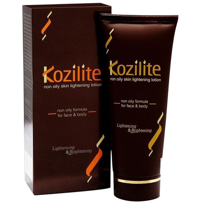 Kozilite Non Oily Skin Lightening Lotion Kozilite Non Oily Skin Lightening Lotion is a non oily skin lightening lotion with special actives that aids in reducing blemishes along with lightening and brightening the skin tone. This formula provides a balance of safety and efficacy with the help of its botanical extracts and special skin lightening actives. It is indicated for generalized pigmentation and melasma. It is helpful for the treatment of blemishes.